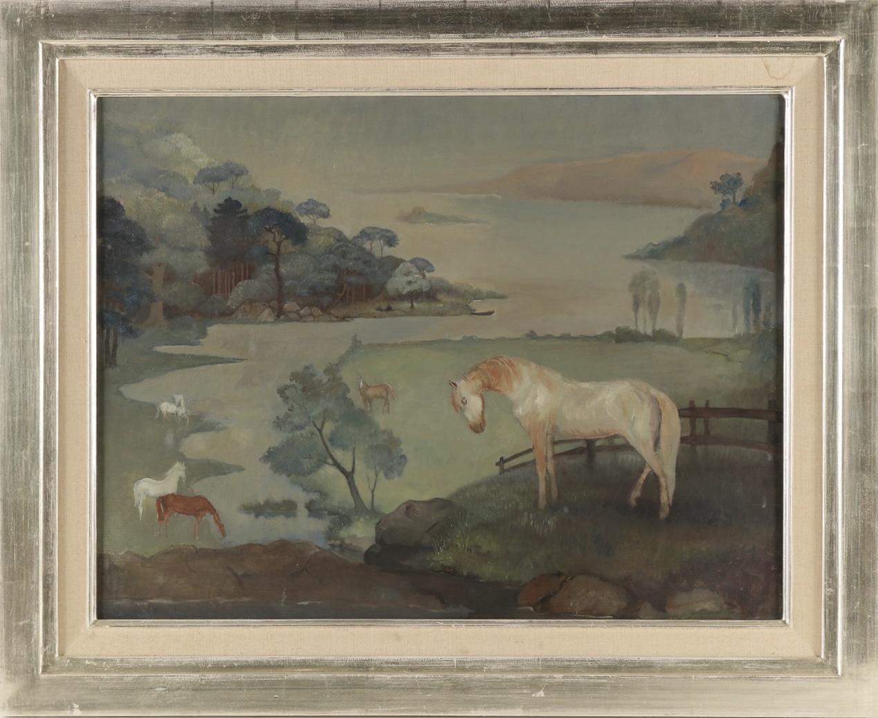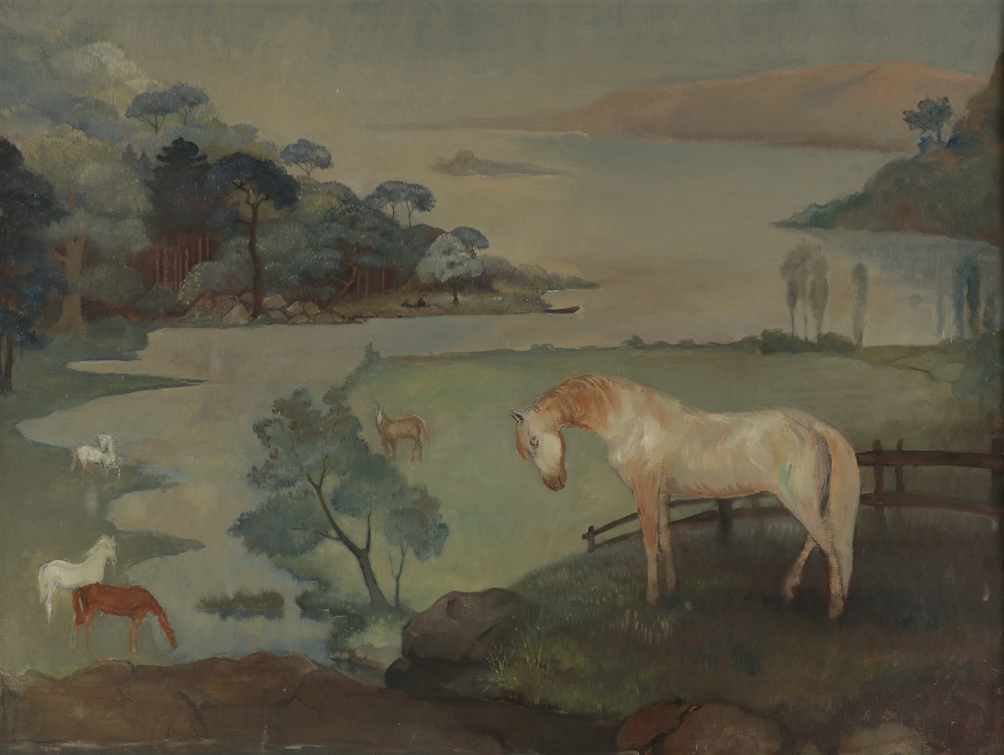 This painting by Jan Zondag depicts a tranquil, slightly surreal landscape. A pale horse stands thoughtfully in the foreground near a simple fence, while other horses graze or wade in a calm river that winds through the scene. Softly layered trees and distant hills create a misty, dreamlike atmosphere, with muted greens, blues, and warm earth tones. The composition feels both realistic and subtly otherworldly, evoking quiet reflection and timeless stillness.