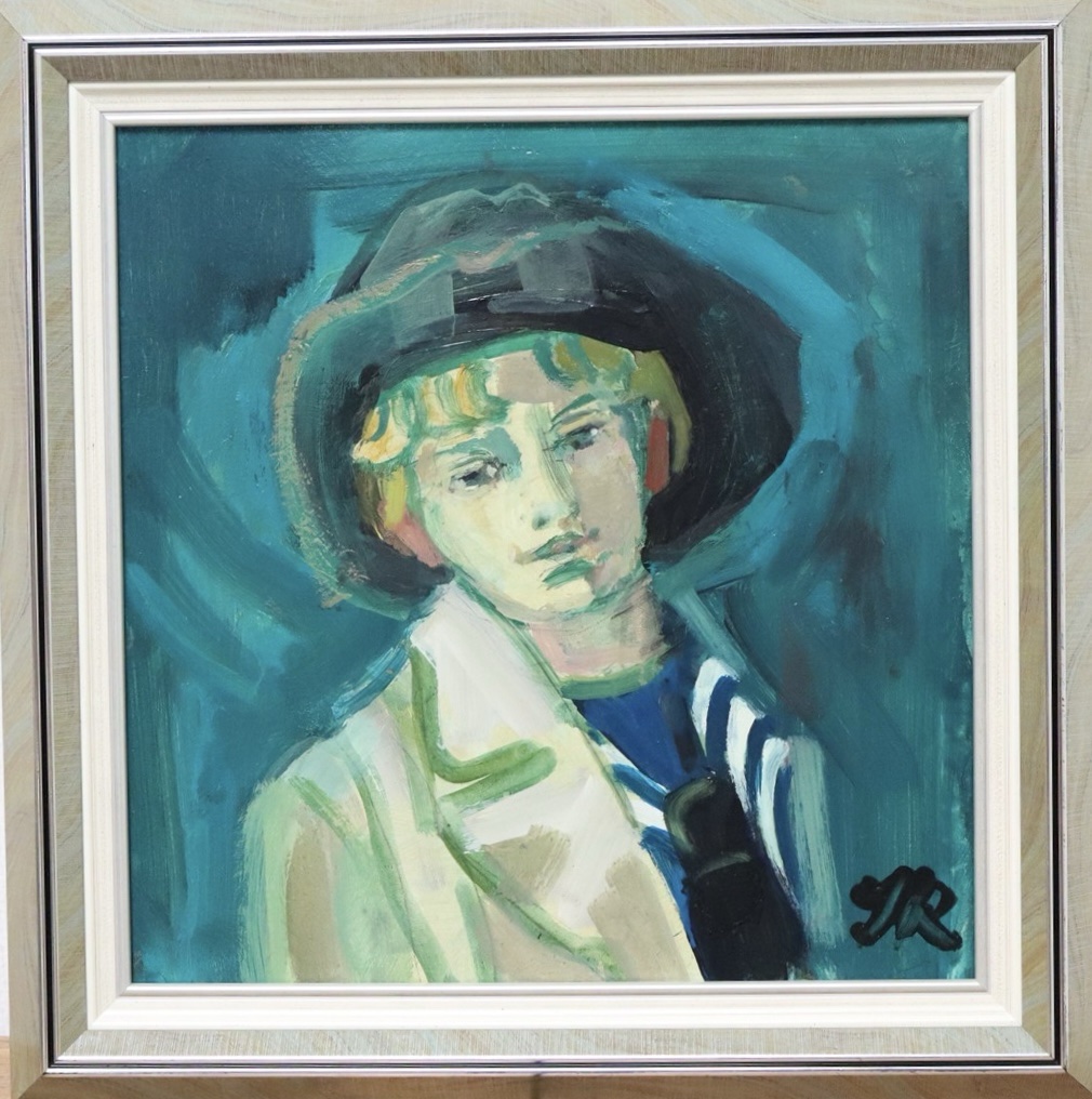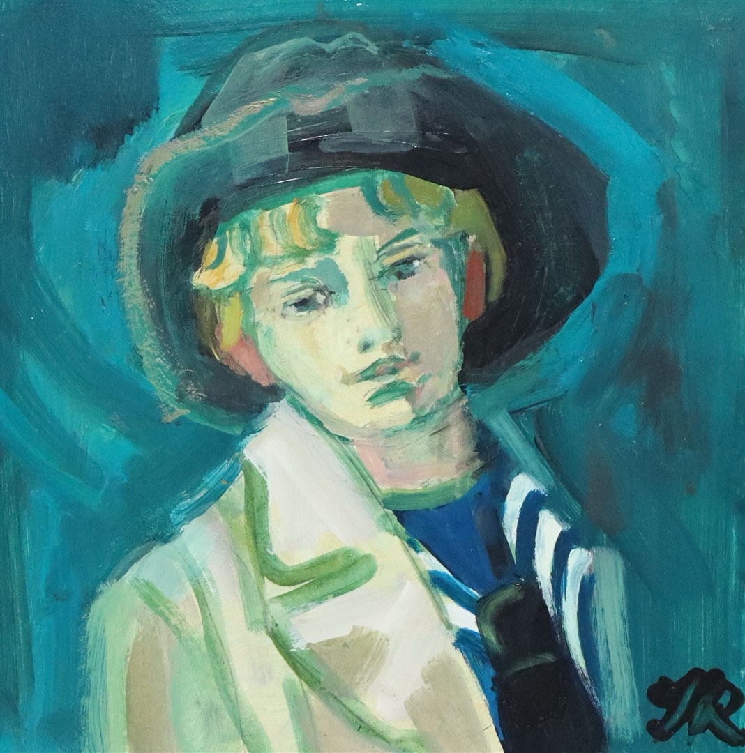 This painting by Jopie Roosenburg-Goudriaan portrays a young figure wearing a broad dark hat and a light-colored coat, set against a swirling blue-green background. The subject’s face is softly modeled with loose, expressive brushstrokes, giving the portrait a slightly introspective and calm mood.