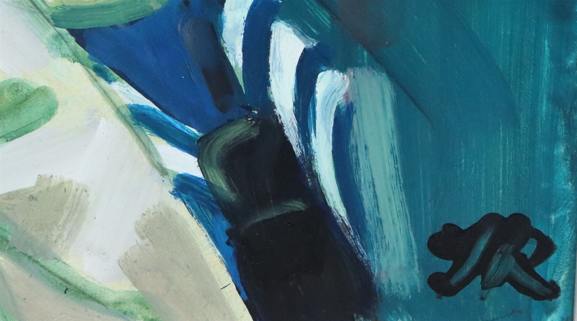 The cool color palette—turquoise, blue, and pale green—dominates the composition and creates a sense of atmosphere rather than strict realism. The simplified forms and visible paint handling draw attention to the emotion and presence of the sitter rather than fine detail. Overall, the work feels intimate and modern, focusing on expression, color, and mood.