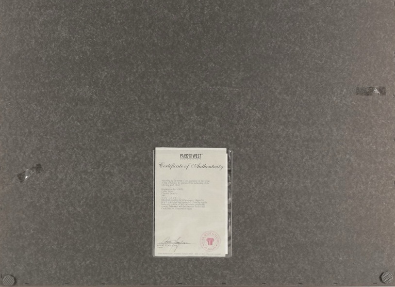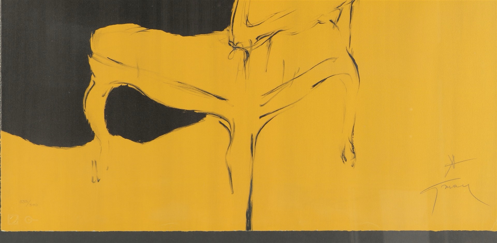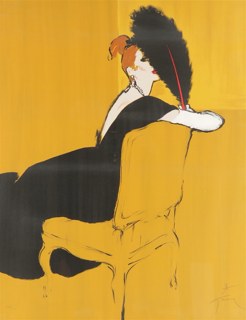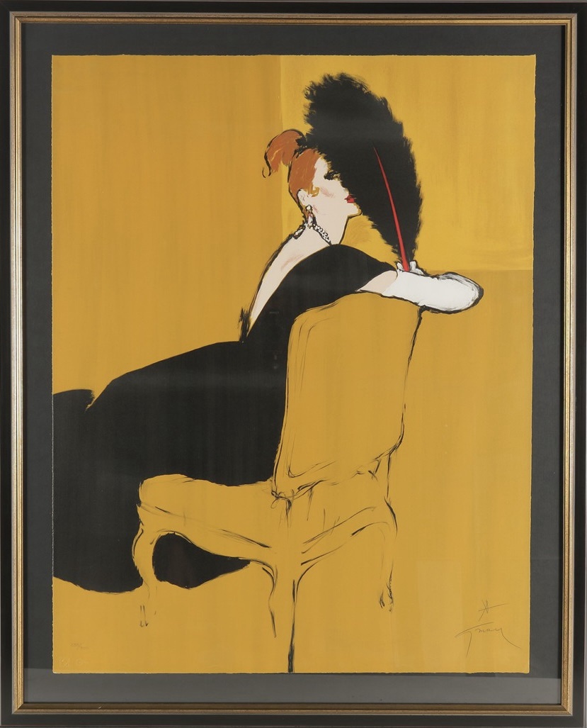 This lithograph by René Gruau shows a stylized woman in a flowing black dress against a bold yellow background. Using minimal lines and strong contrasts, Gruau captures elegance and movement rather than realistic detail. Subtle touches like red lips and jewelry add a sense of luxury, typical of his iconic fashion illustrations.